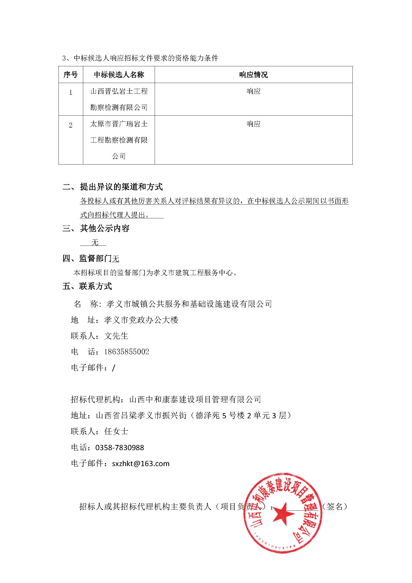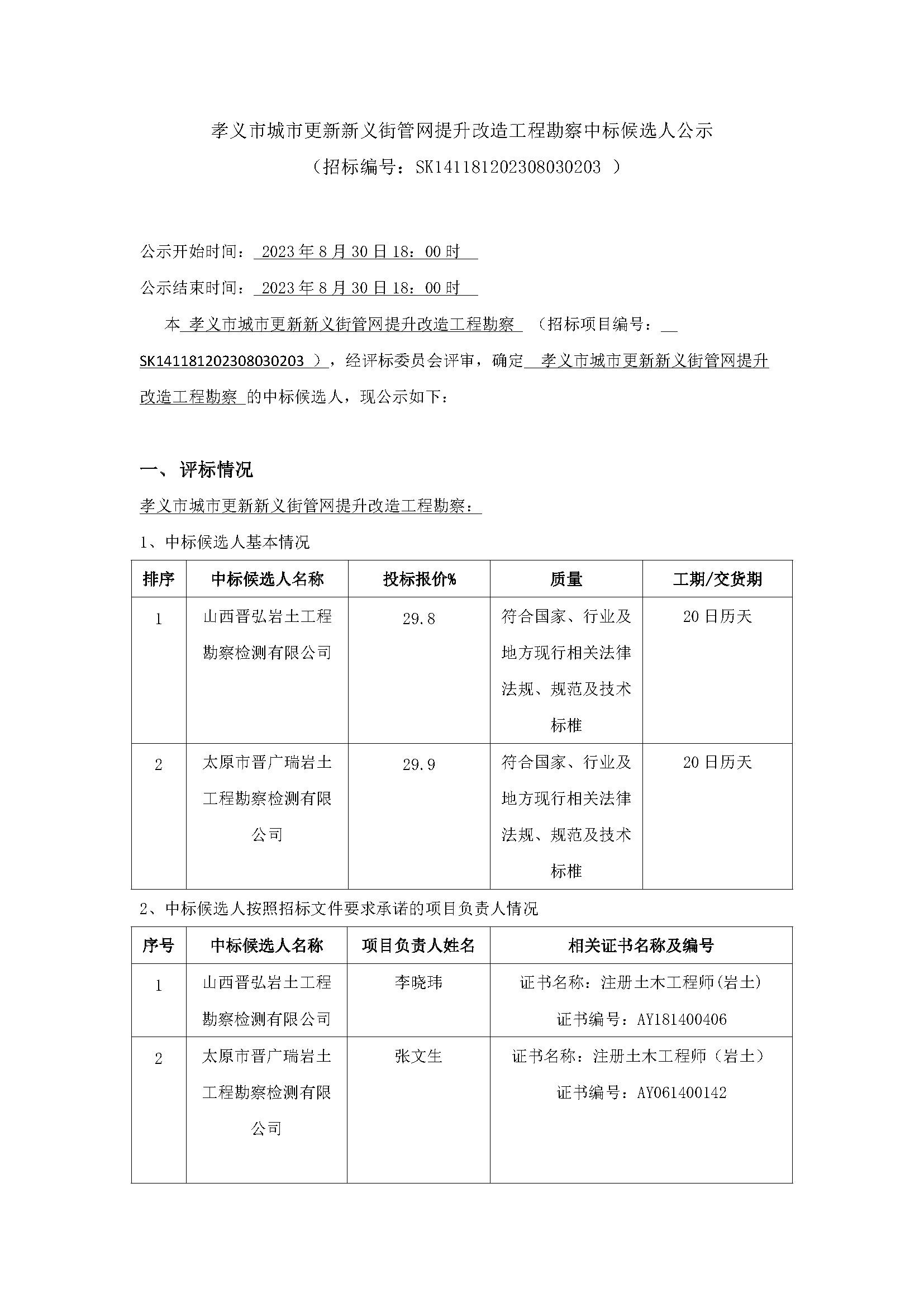 孝义市城市更新新义街管网提升改造工程勘察项目中标候选人公示