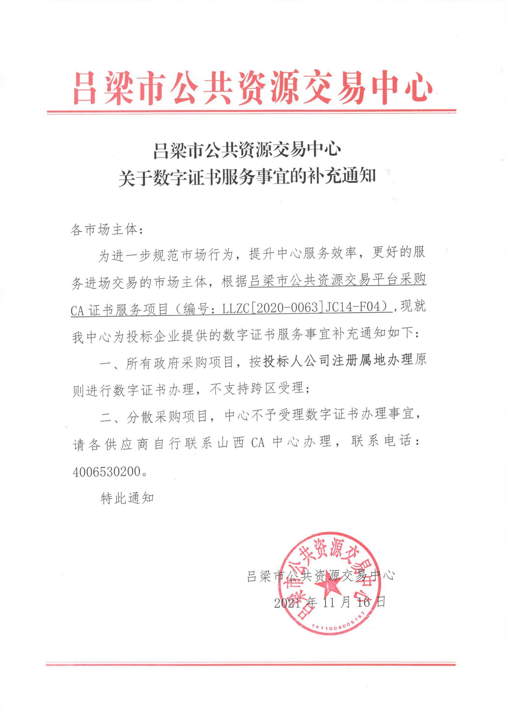 吕梁市公共资源交易中心关于数字证书服务事宜的补充通知